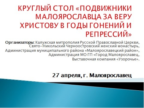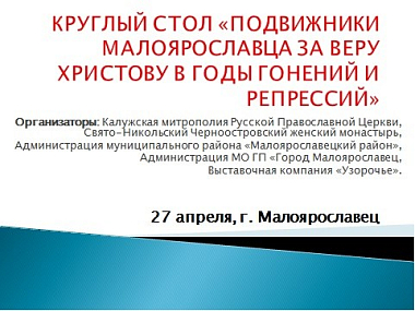27 апреля 2018 года в Духовно-просветительском центре «София» при Свято-Никольском Черноостровском женском монастыре прошел круглый стол «Подвижники Малоярославца за веру Христову в годы гонений и репрессий».