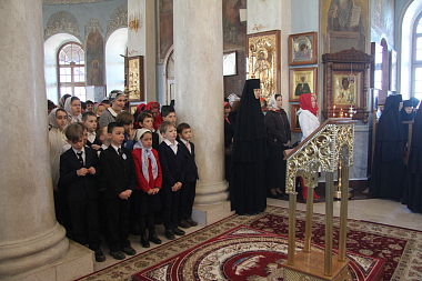 В Большой трапезной сестер, гостей и прихожан монастыря, помимо праздничного обеда, ждало выступление-поздравление младших воспитанниц Православного детского пансиона «Отрада», завершившееся раздачей сладких пасхальных сувениров.