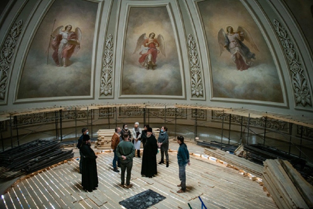 По завершении совещания члены рабочей комиссии по воссозданию росписи собора провели приём альфрейных и живописных работ на центральном куполе Казанского собора и в парусах под барабаном центрального купола.