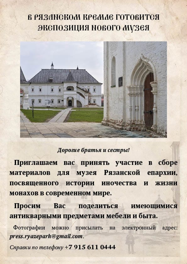 Рязанская епархия приглашает принять участие в сборе материалов для создаваемого музея епархии, посвященного истории иночества и жизни монахов в современном мире, и просит поделиться имеющимися антикварными предметами мебели и быта.