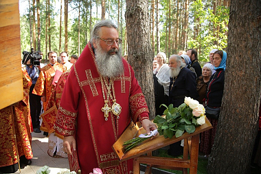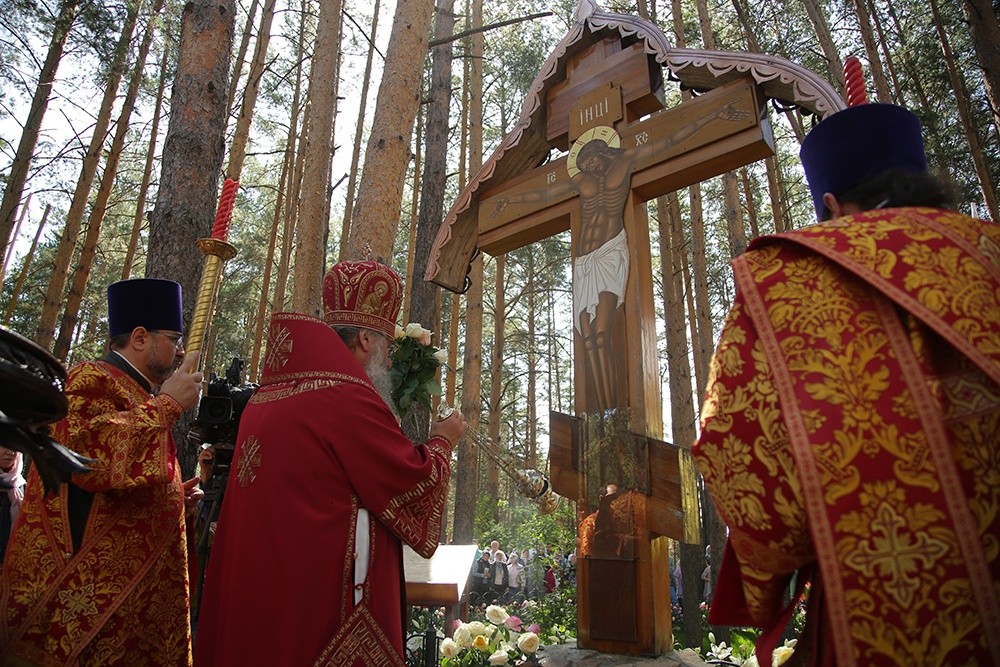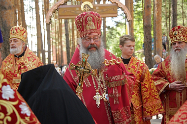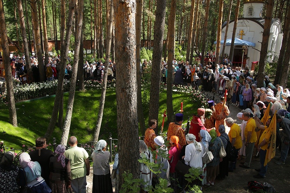 По завершении богослужения состоялся крестный ход к шахте, куда в 1918 году живыми были сброшены алапаевские мученики. У шахты Преосвященные владыки почтили память безвинно убиенных и отслужили заупокойную литию, а также исполнили Херувимскую песнь, которую, как известно, пели сброшенные в шахту мученики в течение нескольких дней, пока они не отошли в мир иной. Вокруг места мученической кончины, ставшего местом притяжения сотен тысяч паломников со всего мира, было совершено каждение и пронесен ковчег с мощами преподобномученицы Великой княгини Елисаветы Феодоровны.