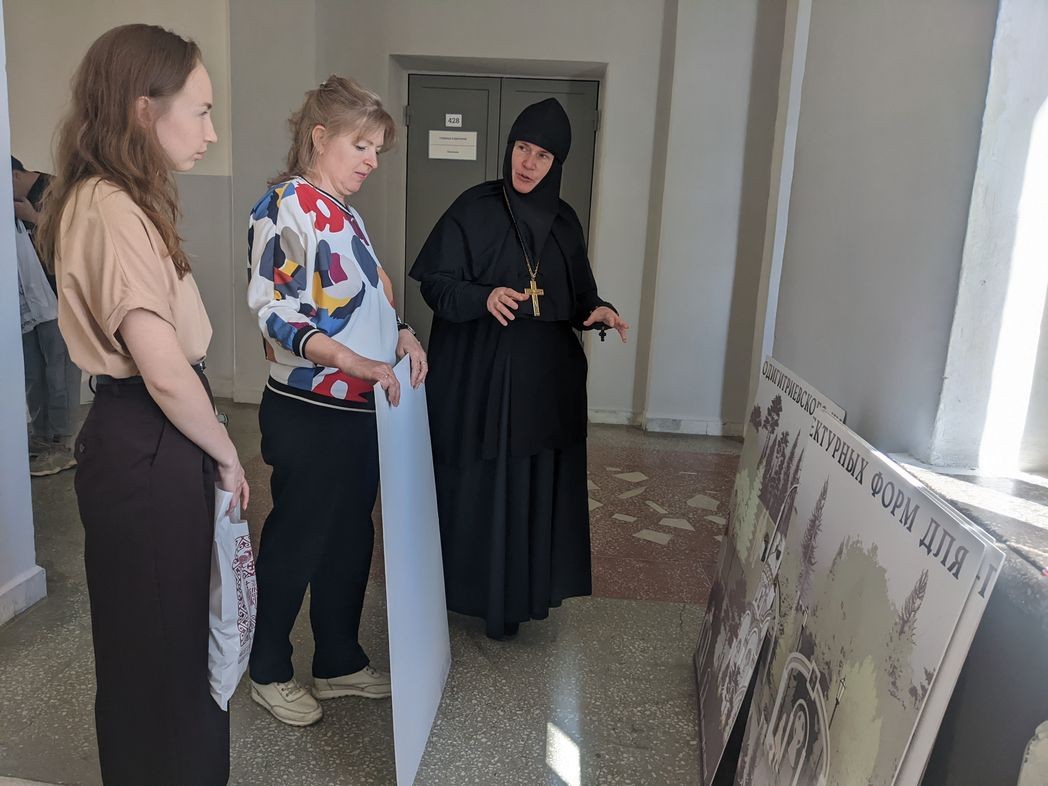 Разрабатывая проект, студентка и её научный руководитель обращались за консультациями к настоятельнице Челябинского Одигитриевского женского монастыря игумении Евсевии (Лобановой). Теперь матушка игумения побывала на защите выпускной работы и поздравила нового специалиста по дизайну архитектурной среды.