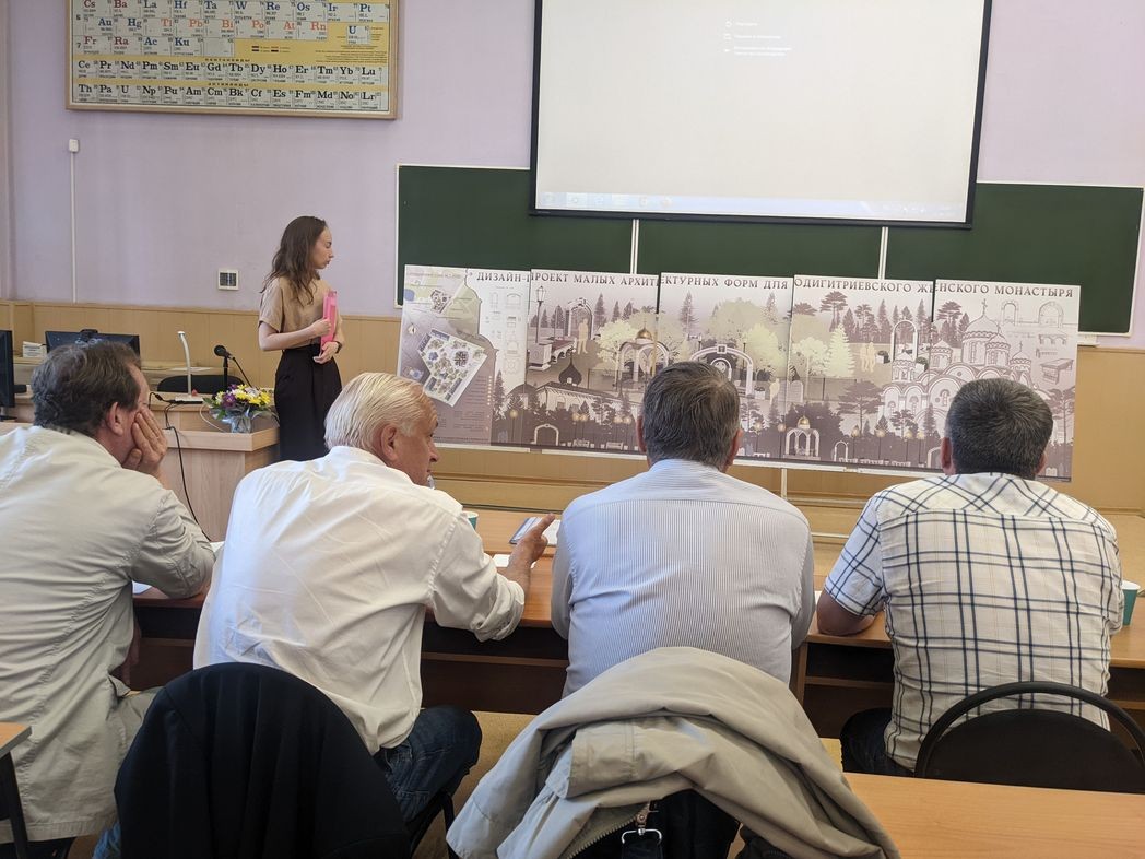 22 июня 2022 студентка кафедры «Дизайн и изобразительные искусства» Южно-Уральского государственного университета Анастасия Байбородова успешно защитила диплом. В качестве выпускной работы она представила Государственной аттестационной комиссии дизайн-проект малых архитектурных форм прихрамовой территории Одигитриевского женского монастыря в Челябинске.