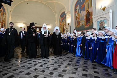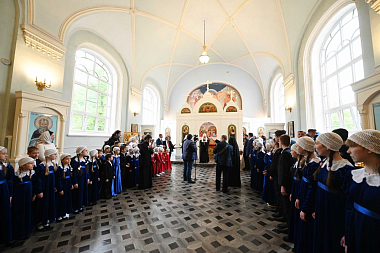 Святейший Патриарх Кирилл проследовал во Введенский храм, где Его Святейшество ожидали духовник школы священник Алексий Красавин, педагоги и учащиеся.