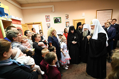 Далее Предстоятель Русской Церкви посетил действующий при Воскресенском Новодевичьем монастыре Центр помощи молодым мамам с детьми «Благодать», расположенный в том же здании.