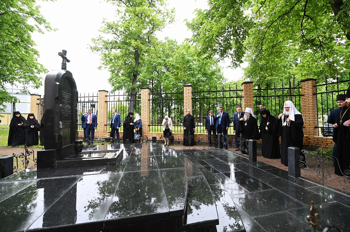 Святейший Владыка также побывал на находящейся во дворе школы могиле Константина Петровича Победоносцева (1827–1907), сенатора, члена Государственного совета, обер-прокурора Святейшего Синода, основателя Свято-Владимирской церковно-учительской женской школы, и Екатерины Александровны Победоносцевой (1848–1932), его супруги, попечительницы Свято-Владимирской школы. К.П. Победоносцев умер 10 марта 1907 года в Санкт-Петербурге и был похоронен согласно завещанию у стены церкви Свято-Владимирской школы (Московский пр., 104, во дворе). Могила К.П. Победоносцева была снесена в 30-е годы XX века и восстановлена в 1992 году.