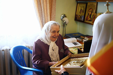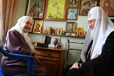 Святейший Владыка побеседовал с 96-летней Натальей Федоровной Устименко, старейшей сотрудницей Санкт-Петербургских духовных школ. Наталья Федоровна была заведующей канцелярией Ленинградской духовной академии и семинарии более десяти лет – с 1973 по 1984 годы, в период ректорства владыки Кирилла – ныне Патриарха Московского и всея Руси. После его перевода на Смоленскую кафедру она не прекратила с ним общения и регулярно ездила в Смоленск на праздники. Сейчас она проживает в богадельне Новодевичьего монастыря.