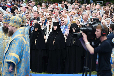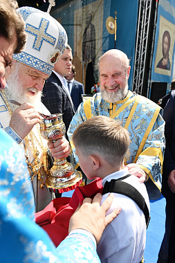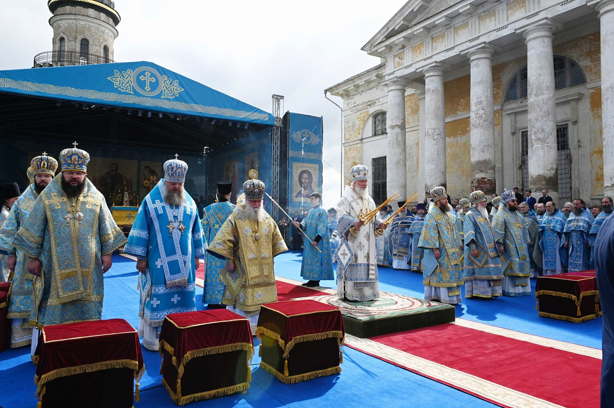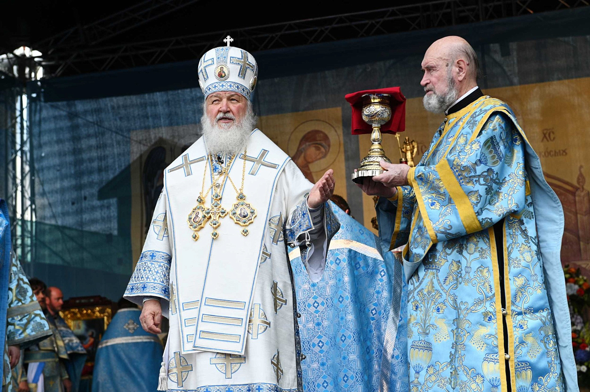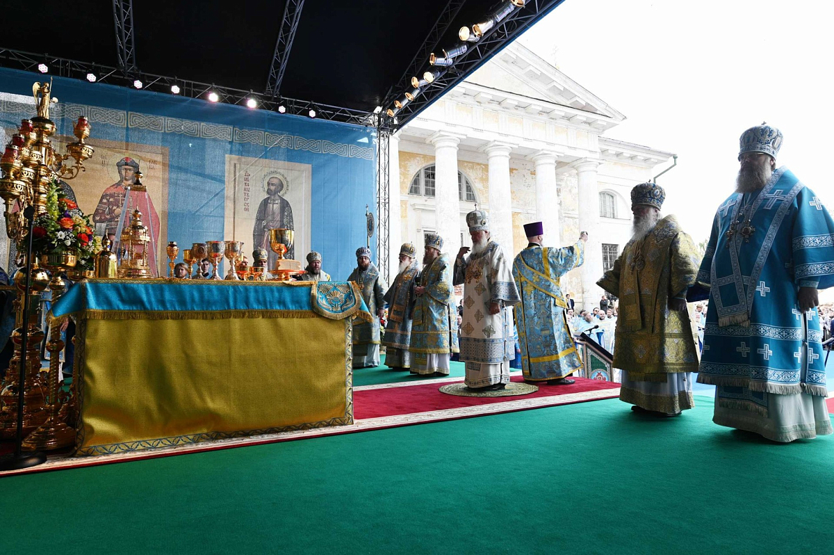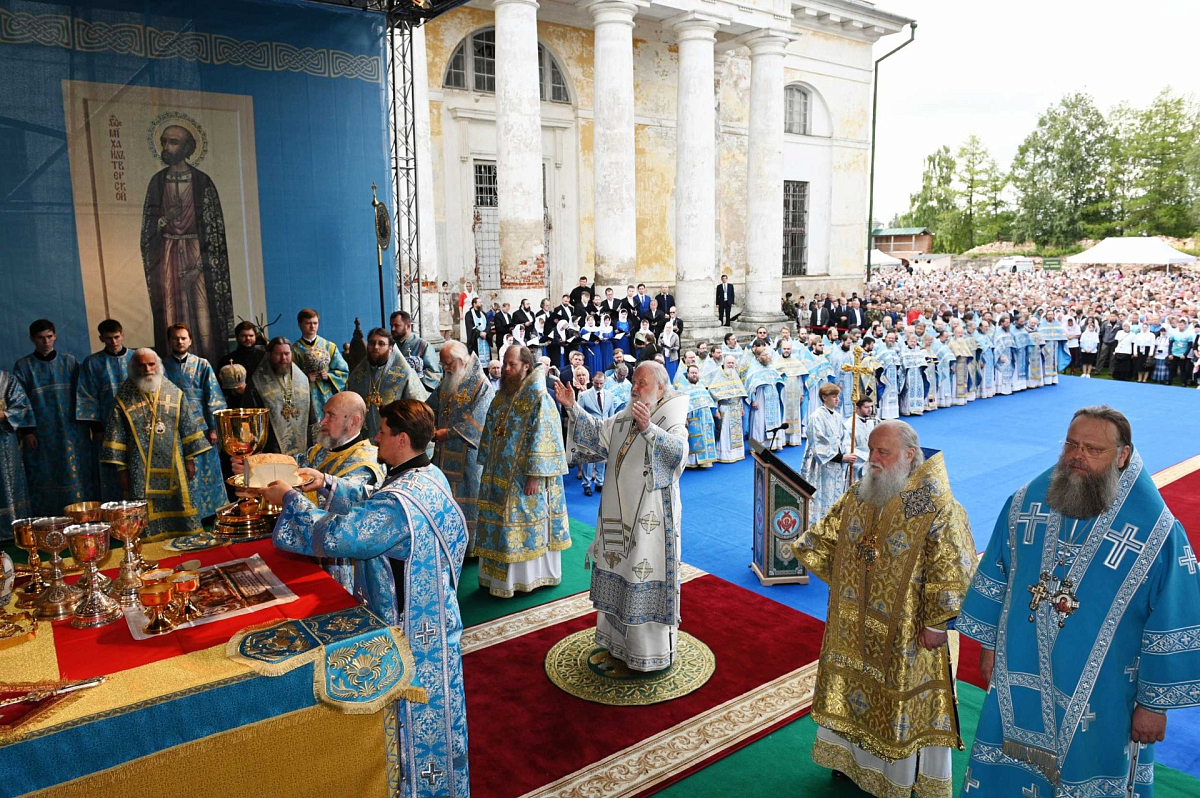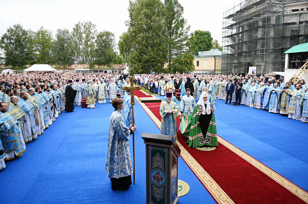 На монастырской площади Святейший Патриарх Кирилл совершил Божественную литургию у престола, установленного под временной сенью близ Борисоглебского собора.