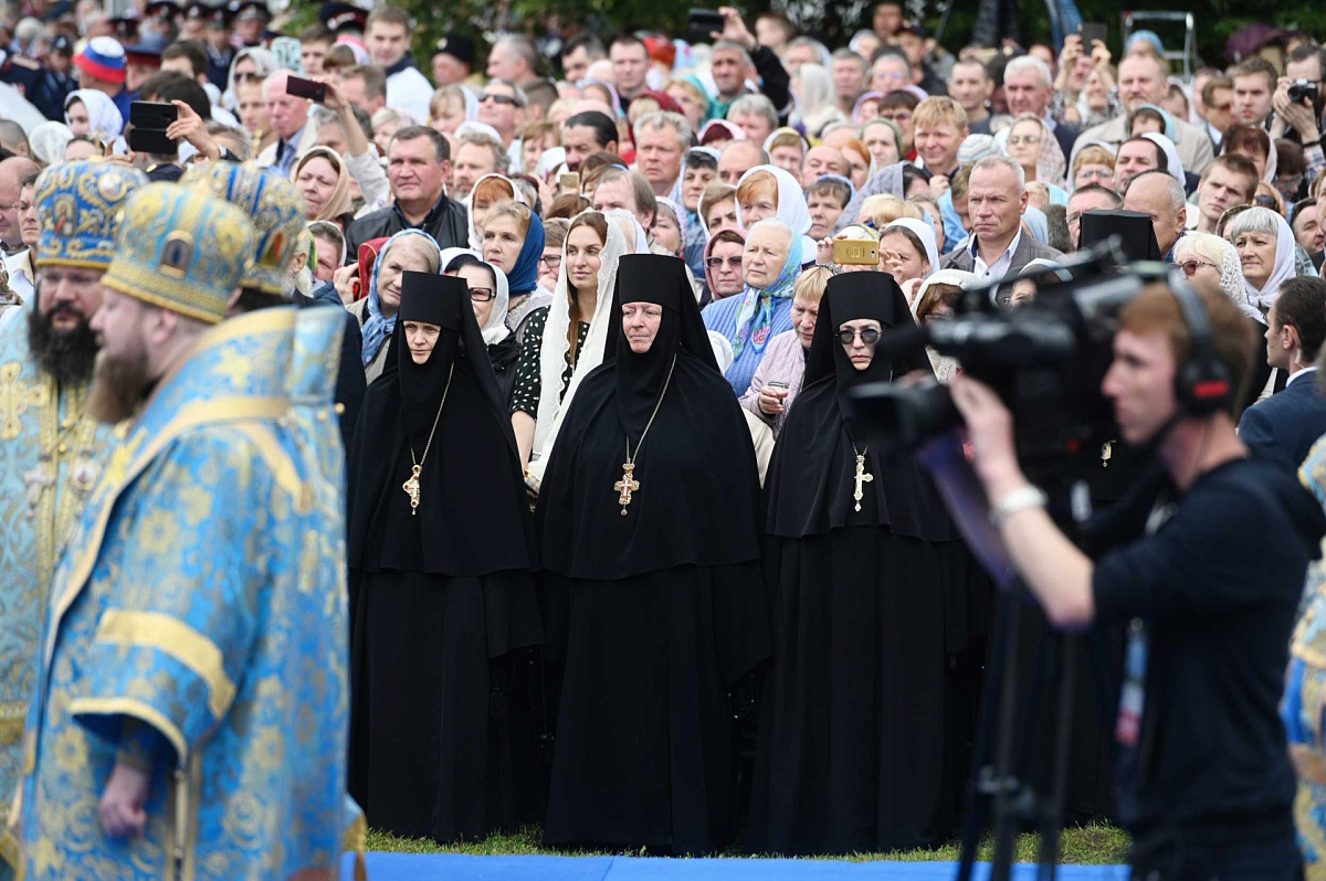 На телеканале «Союз» шла прямая трансляция Литургии. Многочисленные верующие, прибывшие на Патриаршее богослужение, могли наблюдать за трансляцией на большом экране, установленном на территории монастыря.