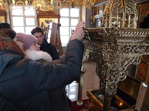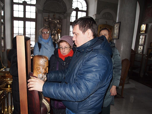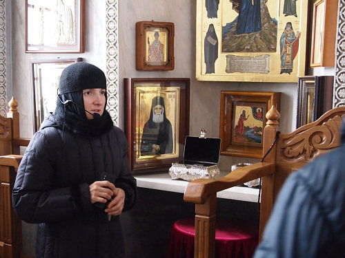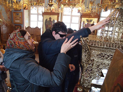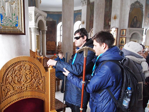 Первая из групп, посетивших монастырь в рамках проекта, состоит в основном из молодых инвалидов по слуху и зрению из реабилитационного центра «Дом слепоглухих» в Пучково. Они были хорошо подготовлены к паломничеству, старательно оказывали помощь друг другу. Сурдопереводом в группе занималась девушка-инвалид по зрению, большую часть поводырей представляли инвалиды по слуху. Сопровождающий группы напоминал и подсказывал экскурсоводу, на что следует обращать внимание, о чем дополнительно сообщить в рассказе – например, о цвете стен или иконостаса, чтобы посещение монастыря оставило больше впечатлений у необычных паломников.