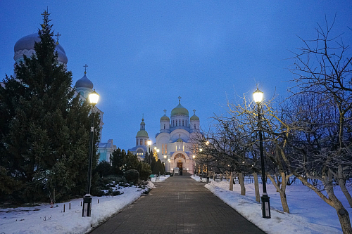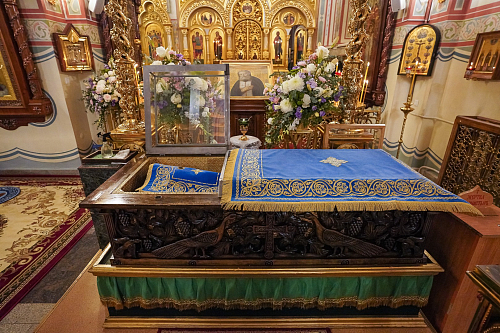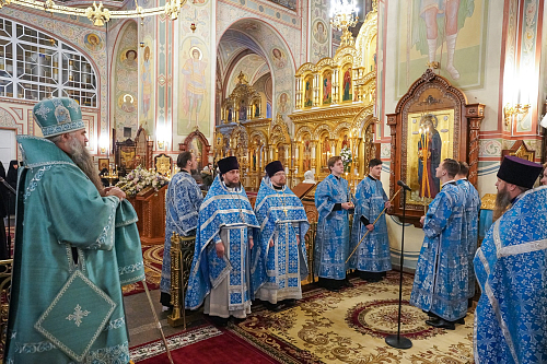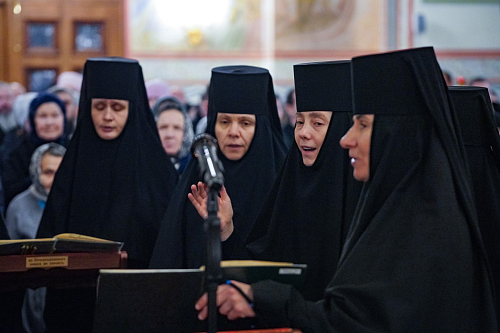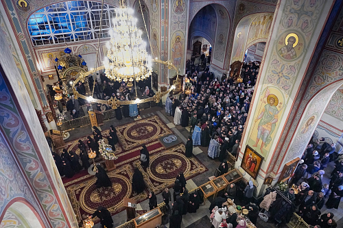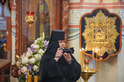 Богослужение состоялось в Преображенском соборе монастыря, где временно пребывает рака с мощами преподобного Серафима Саровского.