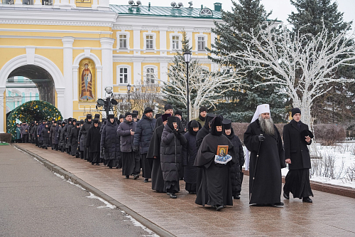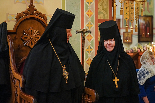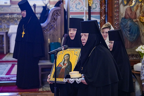 Игумения Сергия выразила Высокопреосвященному владыке благодарность за визит и совершенное богослужение, поздравила с 35-летием со дня монашеского пострига и преподнесла заздравную просфору и написанную сестрами Дивеевской обители икону Божий Матери «Умиление». Этот образ преподобный Серафим Саровский называл «всех радостей радость».