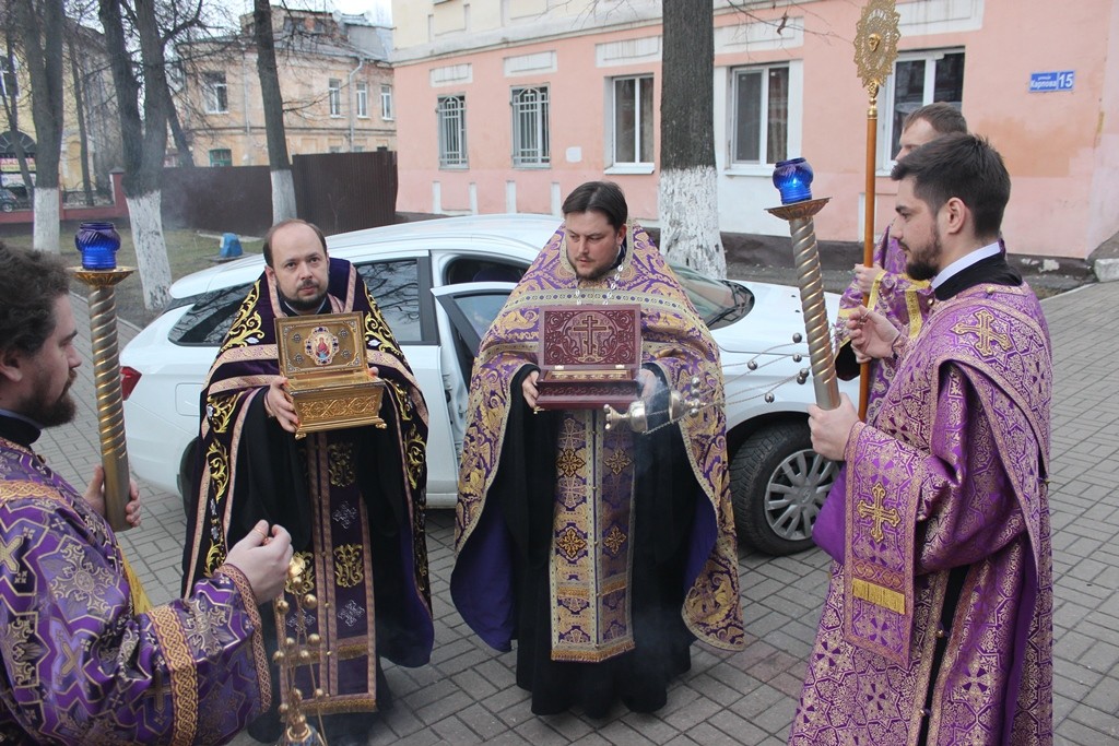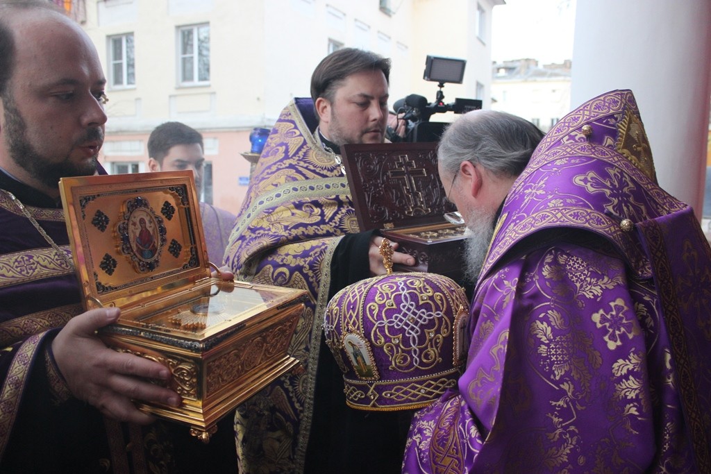 Вместе с архиереем святыни встречали: настоятель Никитского храма г. Калуги протоиерей Алексий Пелевин, протоиерей Антоний Хатунцев, настоятель храма в честь Преображения Господня с. Спас-Суходрев Малоярославецкого района иерей Иоанн Игнахин, настоятель храма в честь Богоявления Господня г. Калуги иерей Максим Коновалов, настоятель храма в честь Благовещения Господня г. Козельска иерей Сергий Барыкин, клирики Никитского храма иереи Максим Картуесов и Олег Плешаков, насельник мужского монастыря Спаса Нерукотворного пустынь иеромонах Зосима (Киблер).