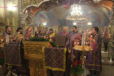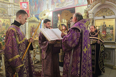 Его Преосвященство с сослужившим духовенством совершили молебен с акафистом Пресвятой Богородице («Взбранной Воеводе победительная...»). Духовенство и верующие коленопреклоненно пропели молитву Пресвятой Богородице «Царице моя преблагая...».