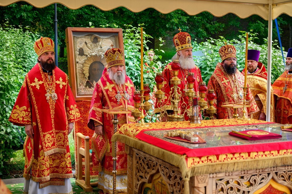 Божественную литургию совершили председатель Синодального отдела по монастырям и монашеству митрополит Каширский Феогност, митрополит Псковский и Порховский Арсений, епископ Великолукский и Невельский Сергий, архиепископ Печерский Матфей, секретарь Псковского епархиального управления протоиерей Андрей Вахрушев, наместник Успенского Святогорского монастыря игумен Василий (Бурков) с братией обители в священном сане, настоятель Свято-Троицкого кафедрального собора города Невель протоиерей Петр Нетреба, наместник Благовещенской Никандровой пустыни архимандрит Спиридон (Иващенко), благочинный по монастырям и монашеству Псковской епархии иеромонах Иннокентий (Селезнев), наместник Спасо-Преображенского Мирожского монастыря иеромонах Серафим (Козулин), исполняющий обязанности наместника Савво-Крыпецкого монастыря иеромонах Всеволод (Сиканов), благочинный храмов города Пскова протоиерей Андрей Большанин, настоятель Свято-Троицкого кафедрального собора города Пскова иеромонах Алексий (Годлевский), благочинные церковных округов и настоятели храмов Псковской митрополии, а также гости праздника в священном сане.