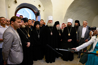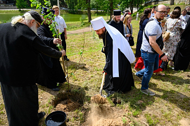 Затем Преосвященные архипастыри ознакомились с промежуточными итогами реставрационных работ в Святогорской обители. В этот же день у стен монастыря состоялась закладка яблоневого сада в память празднования 225-летия со дня рождения поэта.