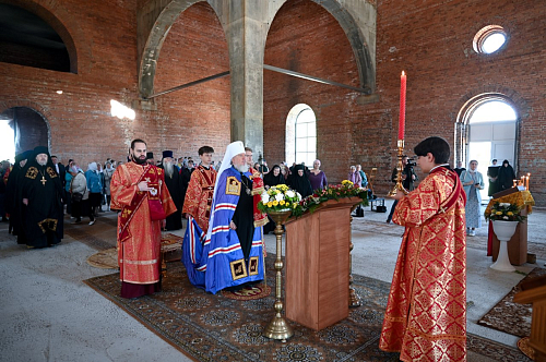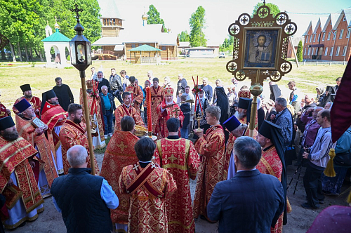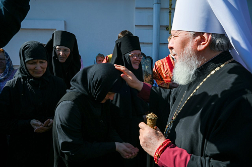 Матушка Серафима поблагодарила архипастыря за совместную молитву в столь значимый для обители день и подарила ему икону Царственных Страстотерпцев, которым будет посвящен придел в Никольском соборе.