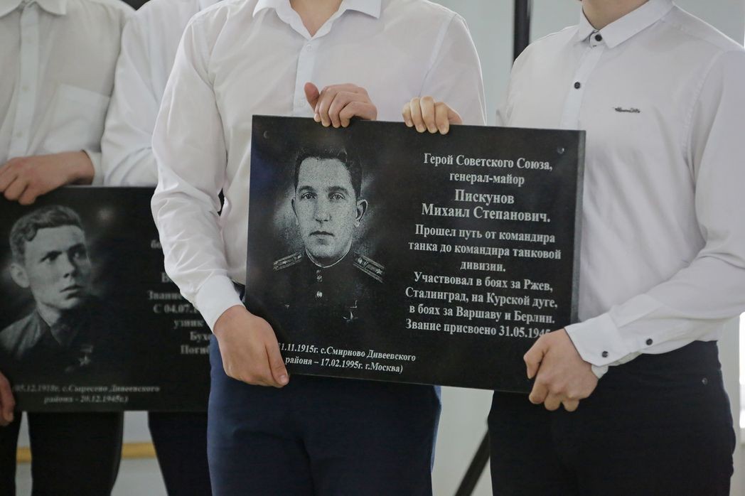 Накануне празднования 78-й годовщины Победы в Великой Отечественной войне 1941-1945 годов старший священник Свято-Троицкого Серафимо-Дивеевского женского монастыря иерей Владимир Каргин и духовник Александринской православной монастырской школы иерей Алексий Курносов освятили пять памятных досок с именами Героев Советского Союза, участников Великой Отечественной войны, которых воспитала Дивеевская земля.
