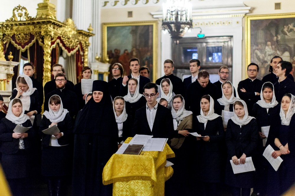 Церковные песнопения исполнил архиерейский хор Лавры под управлением иеродиакона Александра (Урбановича) и смешанный хор Санкт-Петербургской духовной академии под управлением монахини Ксении (Каньшиной).