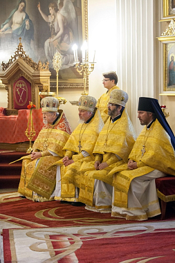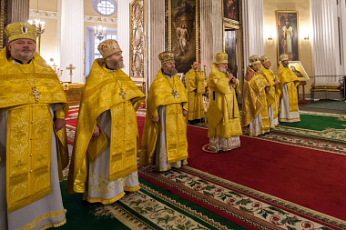 За поздней Литургией владыке Назарию сослужили: настоятель Никольского Морского собора протоиерей Богдан Сойко, настоятель Владимирского собора протоиерей Владимир Сорокин, благочинный Лавры архимандрит Никита (Марков), духовник Лавры архимандрит Виталий (Радомысльский), настоятель храма Богоявления на Гутуевском острове протоиерей Павел Феер, братия и гости обители в священном сане.