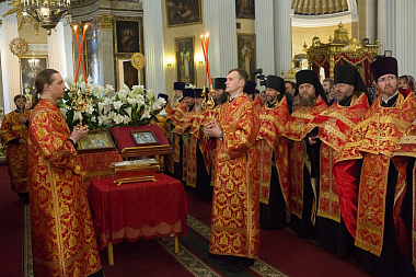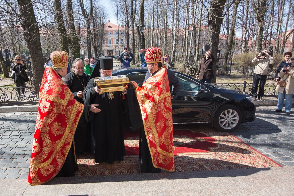 В аэропорту святыню встречали наместник Александро-Невской лавры епископ Кронштадтский Назарий, председатель епархиального информационного отдела протоиерей Александр Сорокин и другие клирики Санкт-Петербургской епархии. В Свято-Троицком соборе Лавры, куда были доставлены мощи, состоялся молебен. После вечернего богослужения был открыт доступ для всех желающих поклониться святыне.