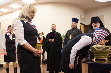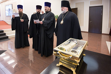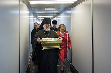 Святыню доставил из Знаменского Синодального собора Нью-Йорка председатель молодежного синодального отдела Русской Православной Церкви Заграницей протоиерей Андрей Соммер. В ковчеге также находится частица мощей мученицы инокини Варвары.