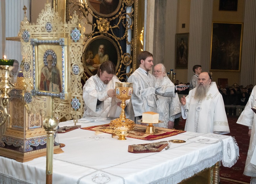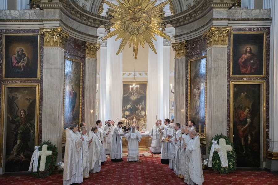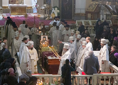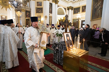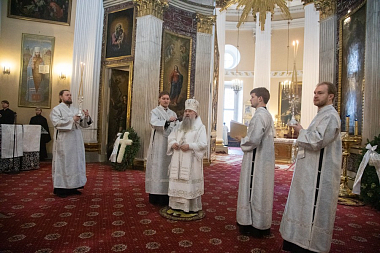 Божественную литургию в Свято-Троицком соборе и чин отпевания возглавил митрополит Санкт-Петербургский и Ладожский Варсонофий.