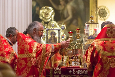К Божественной литургии в собор была доставлена проделавшая путь из Иерусалима лампада с Благодатным огнем, который раздавался верующим.