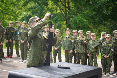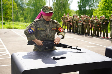 Далее шел конкурс по военно-прикладному спорту – сборке-разборке автомата Калашникова. Московские гости здесь удивили участников и организаторов программы, показав высокие результаты даже с закрытыми глазами. Если с открытыми глазами лучший результат у малоярославецких кадетов, то с завязанными на насколько секунд их обошли москвичи. После конкурса сборки-разборки автомата прошел инструктаж перед началом военизированной эстафеты. Рядом со строевым плацем была подготовлена «полоса препятствий», проходящая через воронки от взрывов 1941 года. Бег по «пересеченной» местности – через разложенные автомобильные шины, проползание под сеткой, стрельба из пневматической винтовки, «минное поле» с едва видной безопасной дорожкой-лабиринтом, ограниченной веревочками, вокруг которой взрывались петарды и дымовые шашки, бег 100 метров с вещмешком и автоматом, «спасение раненого с поля боя» – подползание, наложение жгута и повязки, укладывание на тактические носилки и вынос с «поля боя» – все это 4 команды – малоярославецкая, калужская, московская и сборная калужско-малоярославецкая – делали на скорость. Победителем в эстафете стала калужско-малоярославецкая сборная – они показали самое лучшее время прохождения эстафеты – 6 минут 15 секунд, наилучшую выдержку при звуках и вспышках петард на «минном поле», собранность и организованность при оказании помощи «раненому».