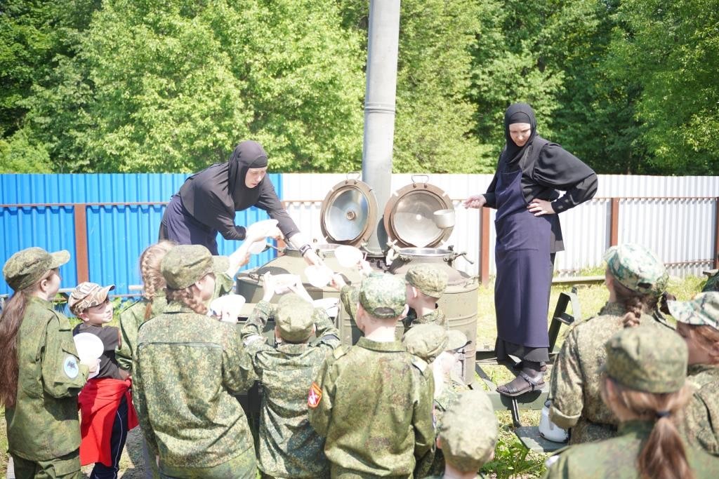 После кинопросмотра был организован полевой обед с солдатской гречневой кашей с тушенкой, которую раздавали из котла полевой кухни, и чаем со сладостями. Затем участники военно-патриотической программы перешли на строевой плац молодежного военно-спортивного лагеря, где прошел смотр творческих культурных номеров. Участники смотра представляли патриотические и военные песни и танцы. Хореографическое направление представляли только казаки-кадеты из Малоярославца с кадетским вальсом и казачьей плясовой «Печка». После танцев в качестве подарка гостям были представлены номера с традиционной казачьей фланкировкой казачьей шашкой под музыку.