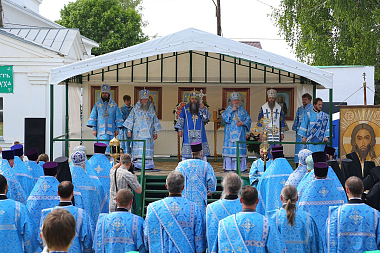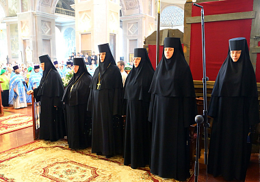 У церковной ограды к сонму архиереев обратилась монахиня Феогноста. Она поблагодарила главу Нижегородской митрополии за пастырское попечение об Алексеевской обители и преподнесла Высокопреосвященнейшему владыке и другим архипастырям заздравную просфору и четки.