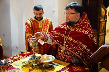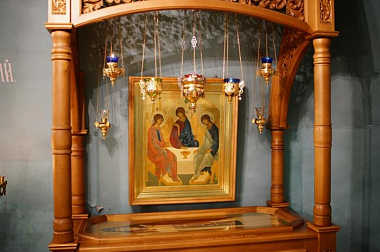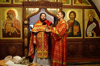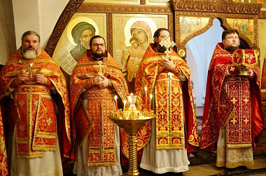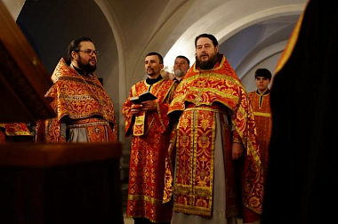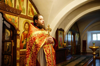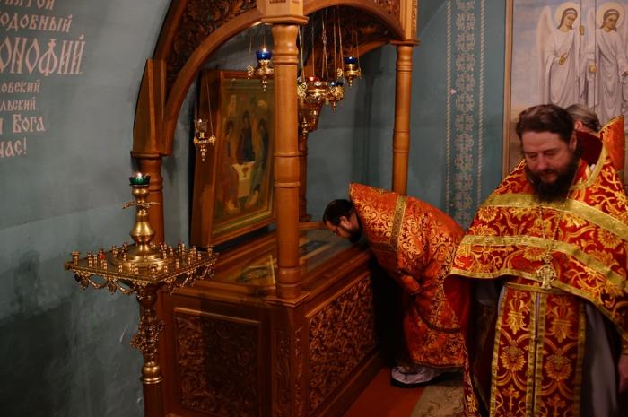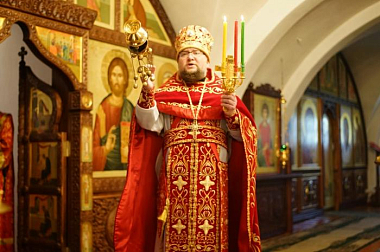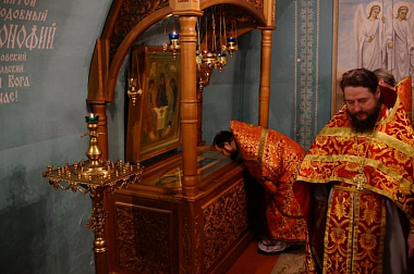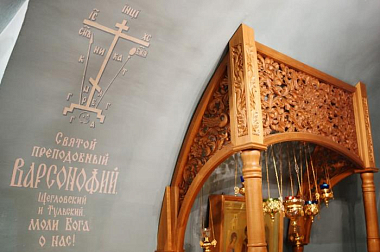 В завершении богослужения благочинный обители отец Феогност обратился к верующим со словами поздравления, затем молившиеся приложились к раке со святыми мощами прп. Варсонофия Щегловского и Тульского, которая пребывает под сенью в алтарной части северного придела собора.