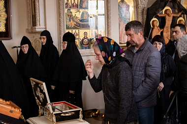 В этот день святыню встречали настоятельница обители игумения Иова (Иванова) с сестрами, священнослужители Борисовского округа, паломники.