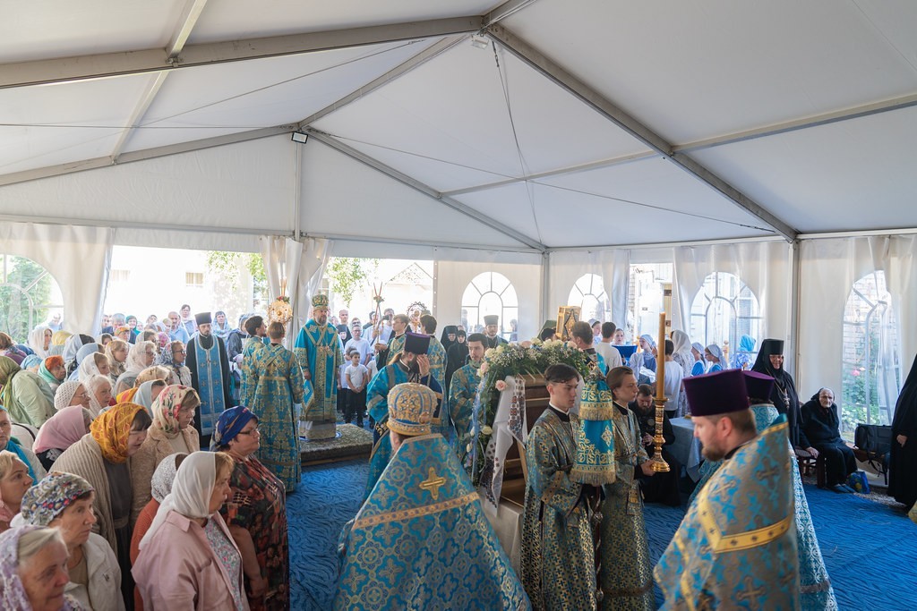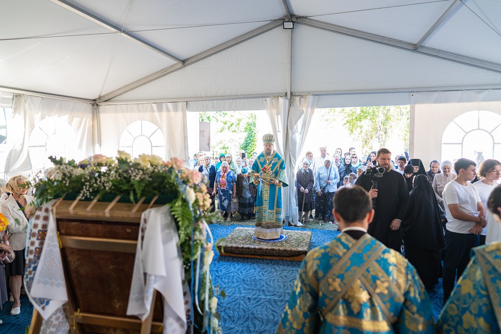 Богослужение проходило в шатре во дворе монастыря. Вместе с паломниками и гостями праздника молились настоятельница Богородицкого Житенного монастыря игумения Елисавета (Евдокимова), настоятельница Верхневолжского Ольгинского монастыря игумения София (Прощаева), глава Осташковского городского округа А.А. Титов, новый глава Селижаровского муниципального округа М.П. Петрушихин.