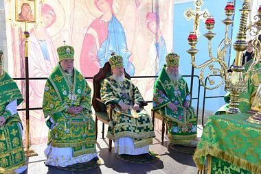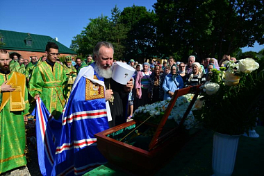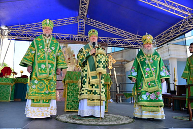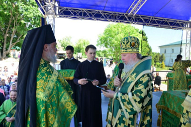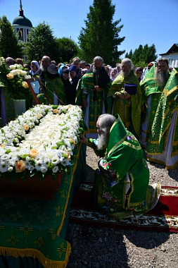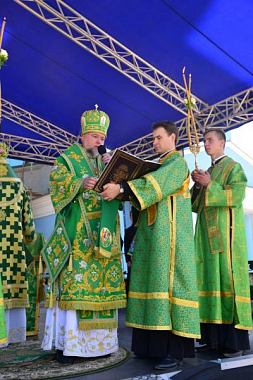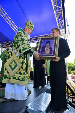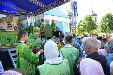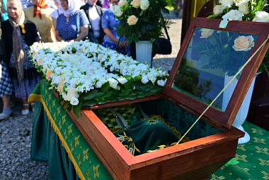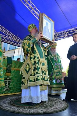 В центре соборной площади была установлена украшенная цветами рака со святыми мощами новопрославленного преподобного.