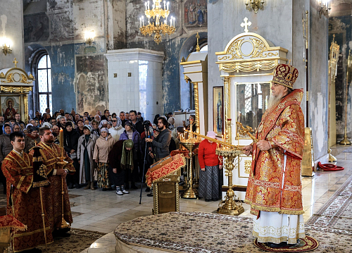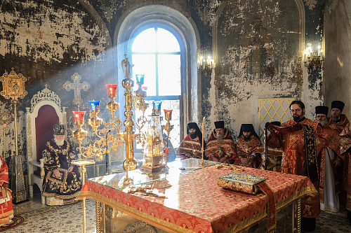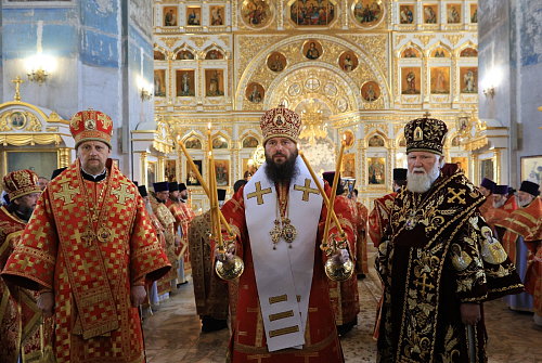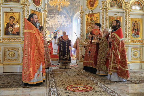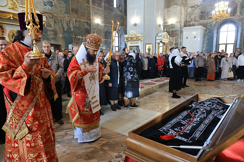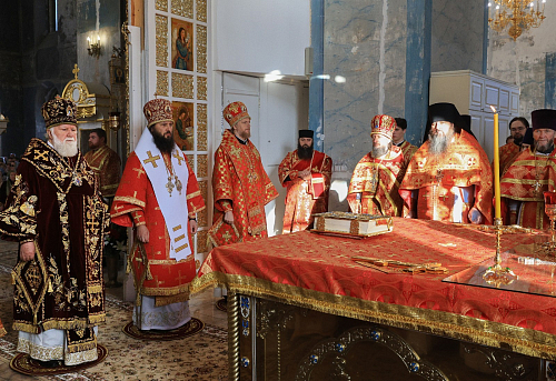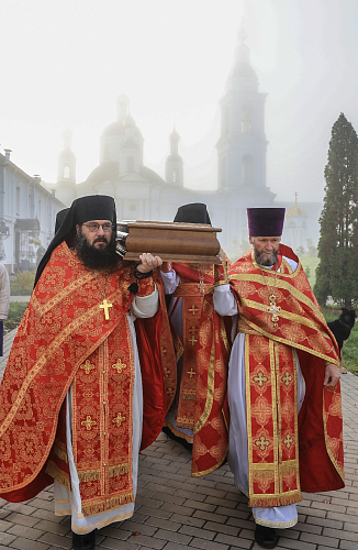 Перед началом Божественной литургии святые мощи были принесены в Богоявленский монастырский собор, где их встретили митрополит Ярославский и Ростовский Вадим, митрополит Волгоградский и Камышинский Феодор, епископ Рыбинский и Романово-Борисоглебский Вениамин, епископ Переславский и Угличский Феоктист, настоятельница обители игумения Антонина с сестрами, священнослужители, монашествующие и верующие. После встречи святых мощей была совершена Божественная литургия.