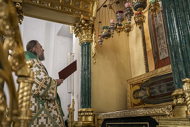 По заамвонной молитве архипастырь в сослужении духовенства совершил славление и вознес молитву преподобному Нилу у раки с его святыми мощами.