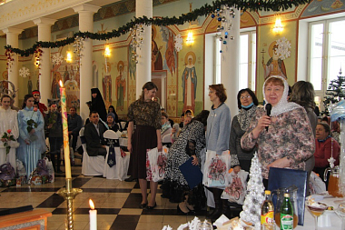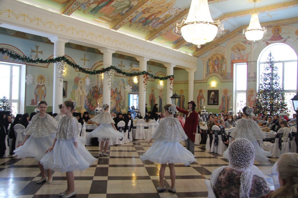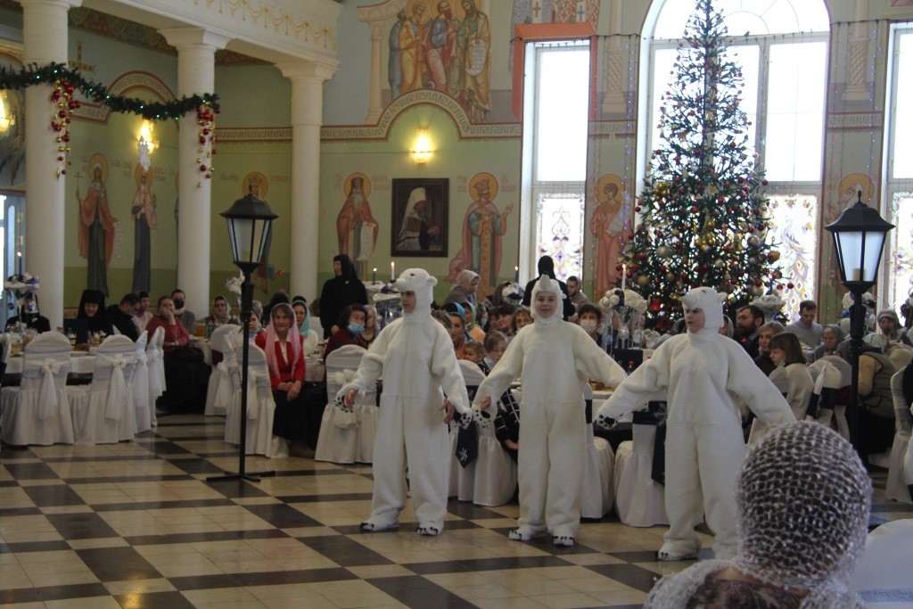 Гостей в трапезной встречали «фонарщики», «снежинки» и «цветы», приветствуя и приглашая в мир сказок. А перед началом обеда появился и сам сказочник – с тростью, в сюртуке и в цилиндре, напомнив, что сказка близко, нужно только не спугнуть ее – «…она давно уже здесь, и только лишь ждет детских сердец… Когда все-все вдруг станут детьми, тогда сказка незаметно появится, она войдет в наши сердца и поведет дорогой добра…» И добавил очень актуальные среди снегов и зимы слова: «Все мы сегодня попали в сказку, но будьте осторожны –вьюга с осколками злого зеркала как никогда разбушевалась в эту зиму и только любовь и молитва уберегут от них…»
