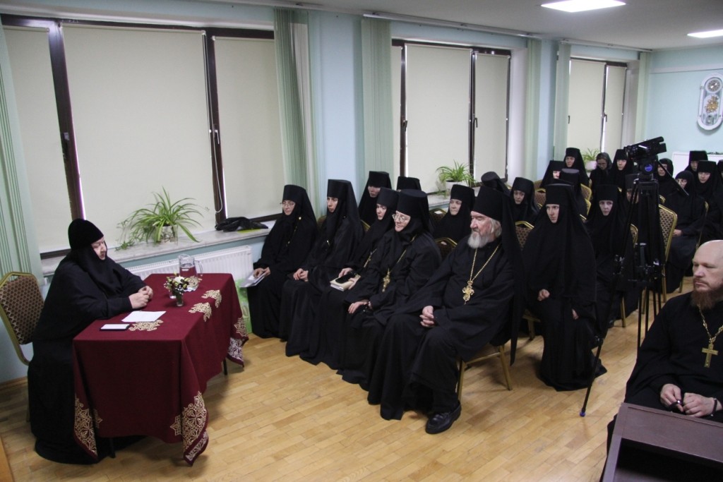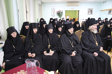 Игумения Михаила (Осипова) поделилась воспоминаниями о смиренных подвижницах – схимонахине Елисавете (Васильчиковой) и схимонахине Марии (Капалиной). Матушка Елисавета происходила из древнего княжеского рода, ведущего свое начало от варяга Симона, строителя Великой Печерской церкви во имя Успения Пресвятой Богородицы. Она приняла крещение от рук святого праведного Иоанна Кронштадтского и была восприемницей преподобномученицы Великой княгини Елисаветы Феодоровны, имя которой впоследствии приняла при постриге в великую схиму. Ей пришлось поучаствовать в сохранении главы преподобного Сергия Радонежского в период гонений, и она передала великую святыню Святейшему Патриарху Алексию I после открытия Троице-Сергиевой лавры. Матушка была одной из первых насельниц Свято-Никольского монастыря и своими молитвами помогала созидать духовную твердыню возрождающейся обители. Схимонахиня Мария (Капалина), родившись в небольшой вятской деревне Белополье, с ранних лет была научена благочестивыми родителями православной вере. Однако рано лишившись матери ей пришлось в полной мере испить чашу страданий, лишений в годы войны и притеснений богоборческого времени. Она воспитывала четверых сыновей в духе подлинного христианского благочестия, с детства приучила их к молитве и посещению храма. В самый разгар гонений на Церковь все четверо сыновей избрали путь служения Церкви, стали почитаемыми архипастырями и пастырями. Игумения Параскева рассказала о том, как ухаживая за матушкой Марией, которая испытывала сильные боли, проводя с ней ночи прочитывали множество акафистов: «А давай этой иконе Божией Матери прочитаем, – говорила матушка, – а теперь давай еще вот этот акафист почитаем…» Терпеливо перенося боль и немощь схимонахиня Мария являла собой пример живой веры и горячей любви к Богу, ее терпение, радость и благодарность Богу послужили духовному укреплению сестер обители.