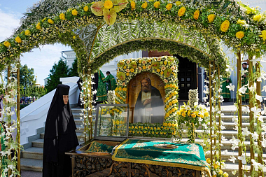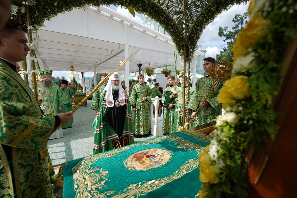 Святейший Владыка возглавил служение Божественной литургии под открытым небом на площади перед Преображенским собором монастыря у раки с честными мощами преподобного Серафима, по сложившейся традиции принесенными перед началом богослужения из Троицкого собора и поставленными за престолом.