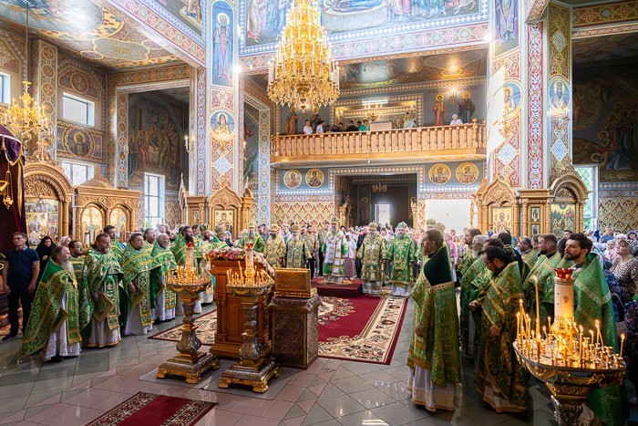 Предстоятель Православной Церкви Казахстана возглавил Божественную литургию в Софийском соборе Иверско-Серафимовского монастыря. Главе Митрополичьего округа сослужили архипастыри Православной Церкви Казахстана: архиепископ Павлодарский и Экибастузский Варнава, архиепископ Карагандинский и Шахтинский Севастиан, архиепископ Усть-Каменогорский и Семипалатинский Амфилохий, архиепископ Кокшетауский и Акмолинский Серапион, викарии Астанайской епархии – епископ Талдыкорганский Клавдиан и епископ Талгарский Вениамин.
