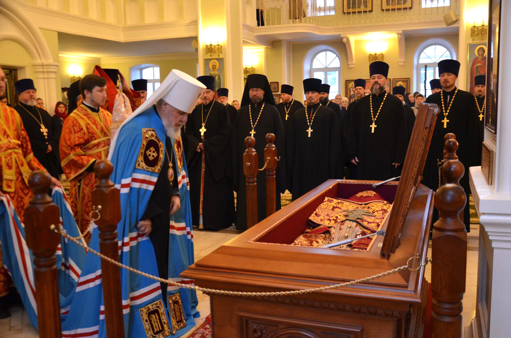 По окончании Литургии глава Пермской митрополии в сослужении духовенства Пермской епархии совершил славление священномученику иерею Петру (Вяткину).