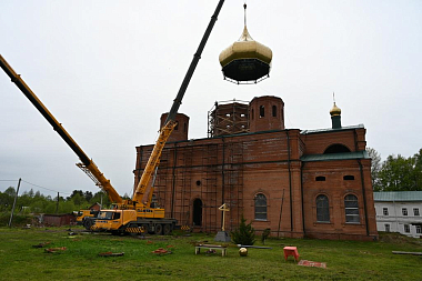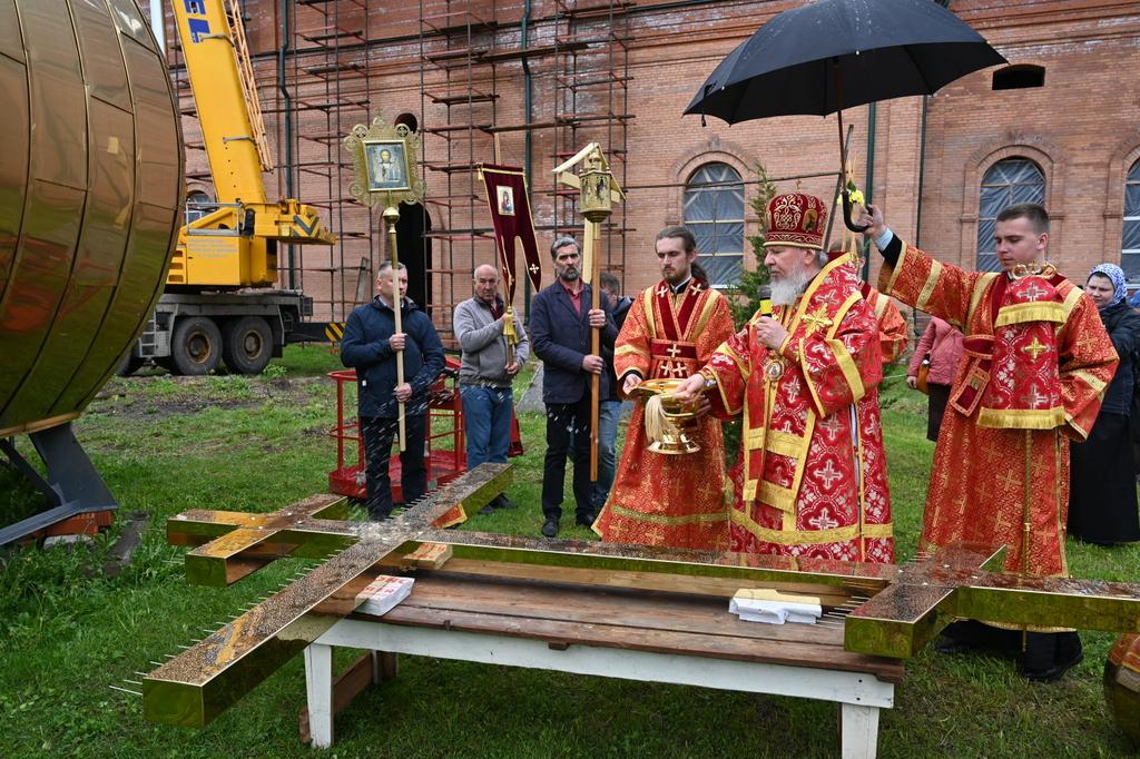 По окончании Литургии Владыка Александр возглавил крестный ход к восстанавливаемому Никольскому собору, который был разрушен в 1930 году, и совершил чин освящения купола и креста на храм.