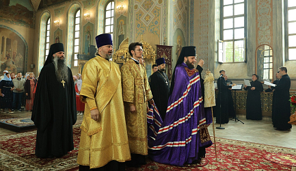 За Божественной литургией Его Преосвященству сослужили настоятель Вознесенской Давидовой пустыни игумен Сергий (Куксов), секретарь Подольского епархиального управления иерей Константин Семенов, клирики обители.