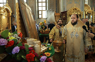 По заамвонной молитве был совершен крестный ход с иконой Всемилостивого Спаса. После чего, вернувшись в храм, было совершено поклонение Честному и Животворящему Кресту Господню и вознесена молитва ко Господу на освящение нового медового урожая.