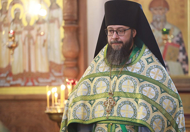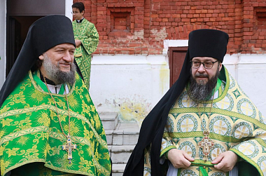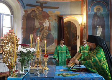 Его Преосвященству сослужили благочинный монастырей игумен Серафим (Котенёв), настоятель монастыря игумен Серафим (Семилетов) и братия обители в священном сане.