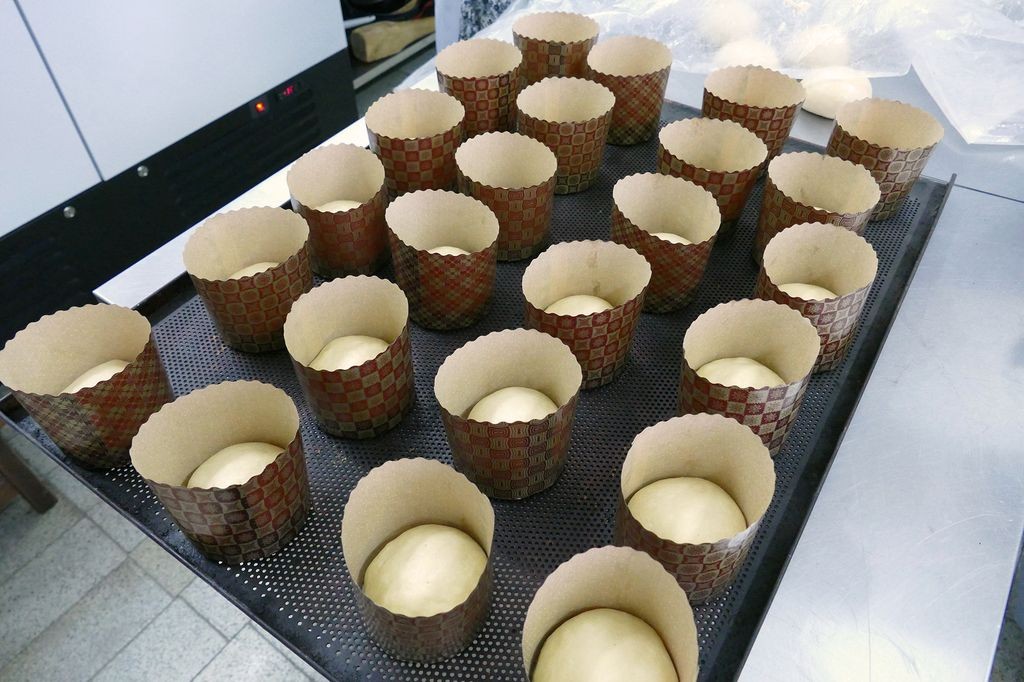 7. Сразу же начинаем раскладывать куличи по формам. Мы взвешиваем тесто на весах. Большой кулич – 1200 г теста, средний – 850 г, маленький – 250 г. Формируем куличи аккуратно, чтобы верх после выпечки был ровный. С верхов убираем торчащий изюм. Протыкаем кулич тонкой спицей в четырех местах.