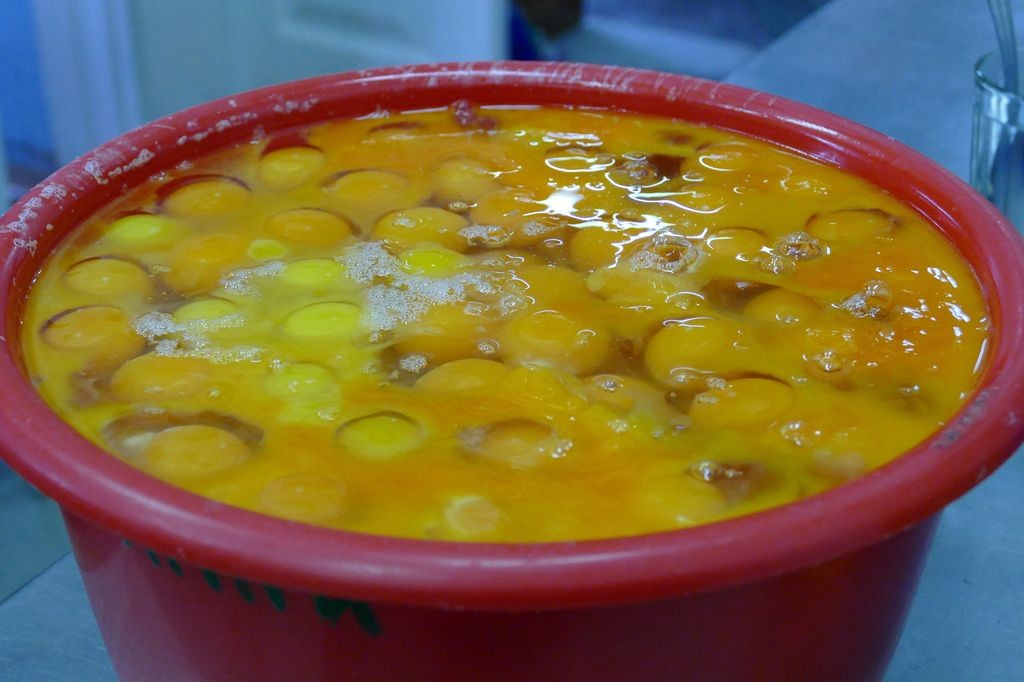 3. Добавляем 15 яиц (и желтки, и белки), 700 г сахара. Взбиваем 15 мин.