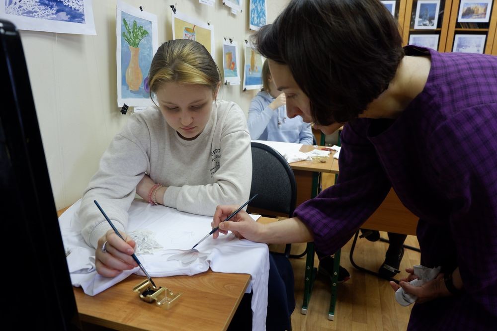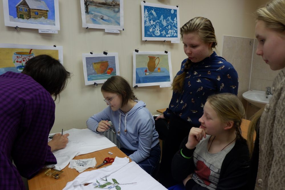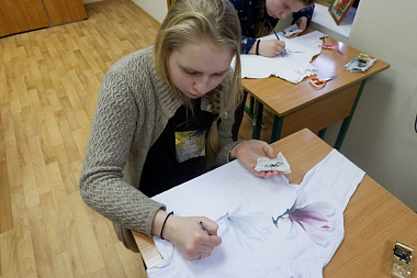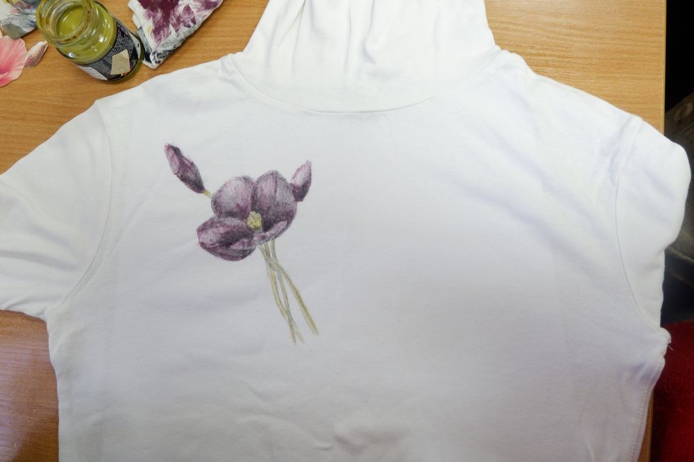 «В воскресенье в нашей школе проходил мастер-класс по дизайну одежды. Мы украшали обычные водолазки художественной росписью, рисовали на них цветы, которые выглядели, как настоящие. Это техника рисования сухой кистью на ткани специальными красками.