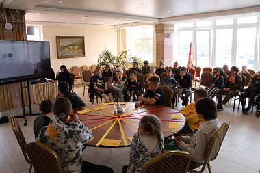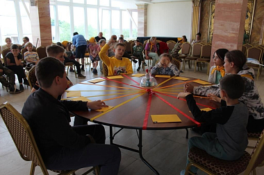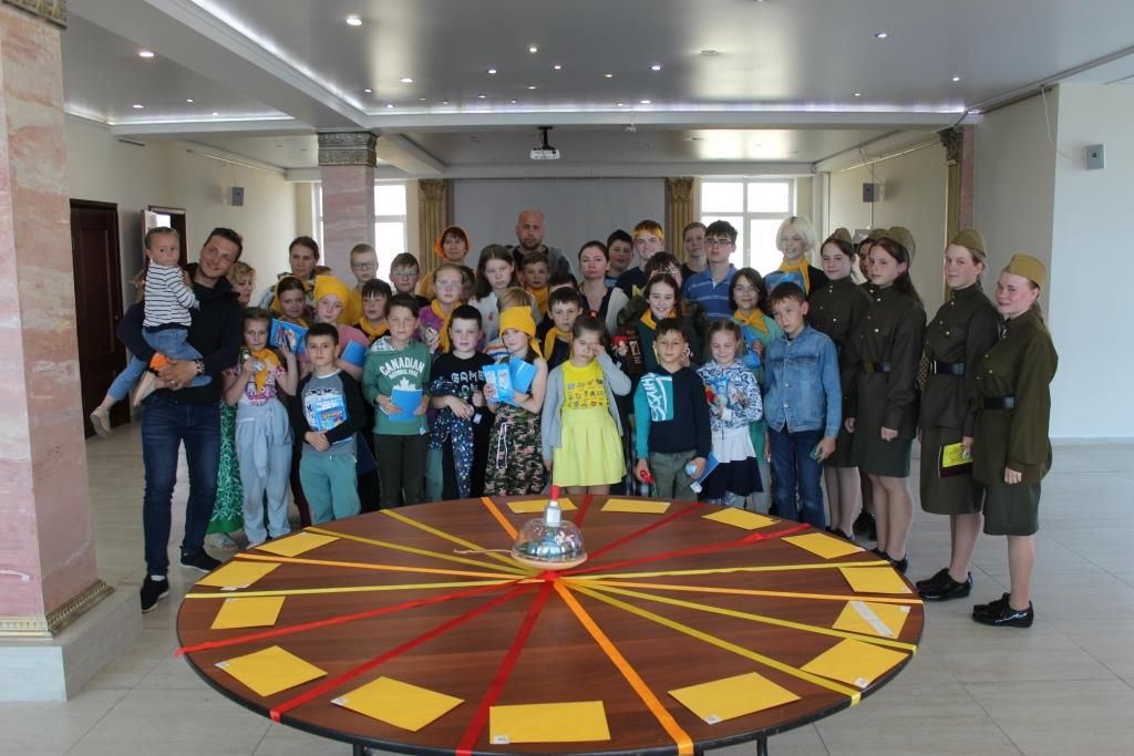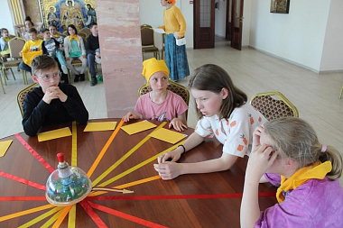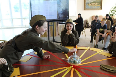 Четыре команды московских школьников из духовно-просветительского лагеря «Сила духа – каникулы для души» соревновались между собой и с командой воспитанниц детского православного пансиона «Отрада». Названия команд: «Зет», «Поколение», «Атомы», «Молодая Гвардия» и «Барс». Вопросы – на знание истории Великой Отечественной войны, точнее более узко – периода Битвы за Москву и знание основ Православия. Поэтому в «черный ящик» попадали то советский фотоаппарат для фронтовых корреспондентов – ФЭД или копия карты Генерального штаба, то восковая свеча, то чеснок – в вопросе про растение, сок которого используют иконописцы, то просфора, то солдатская фляжка времен Великой Отечественной войны. Курвиметр выпуска 1941 года из музейно-образовательного комплекса «Ильинские рубежи 1941» ребята пустили после ответа на вопрос по рукам – чтобы получше рассмотреть исторический экспонат. В вопросах с фотографиями и короткими видео вспоминались герои Битвы за Москву – панфиловцы, Александр Доватор, Подольские курсанты, маршал Г.К. Жуков, святая блаженная Матрона Московская. Игра прошла очень напряженно, и после трех туров для выяснения победителей пришлось устраивать конкурс капитанов команд. Малоярославецкая команда «Молодая Гвардия» отдала московским гостям из «Барса» первое место. Третье место поделили две московские команды «Зет» и «Атомы». Призы достались большинству решившихся выйти на игру команд, а остальным – утешительные подарки со сладостями и игрушками.